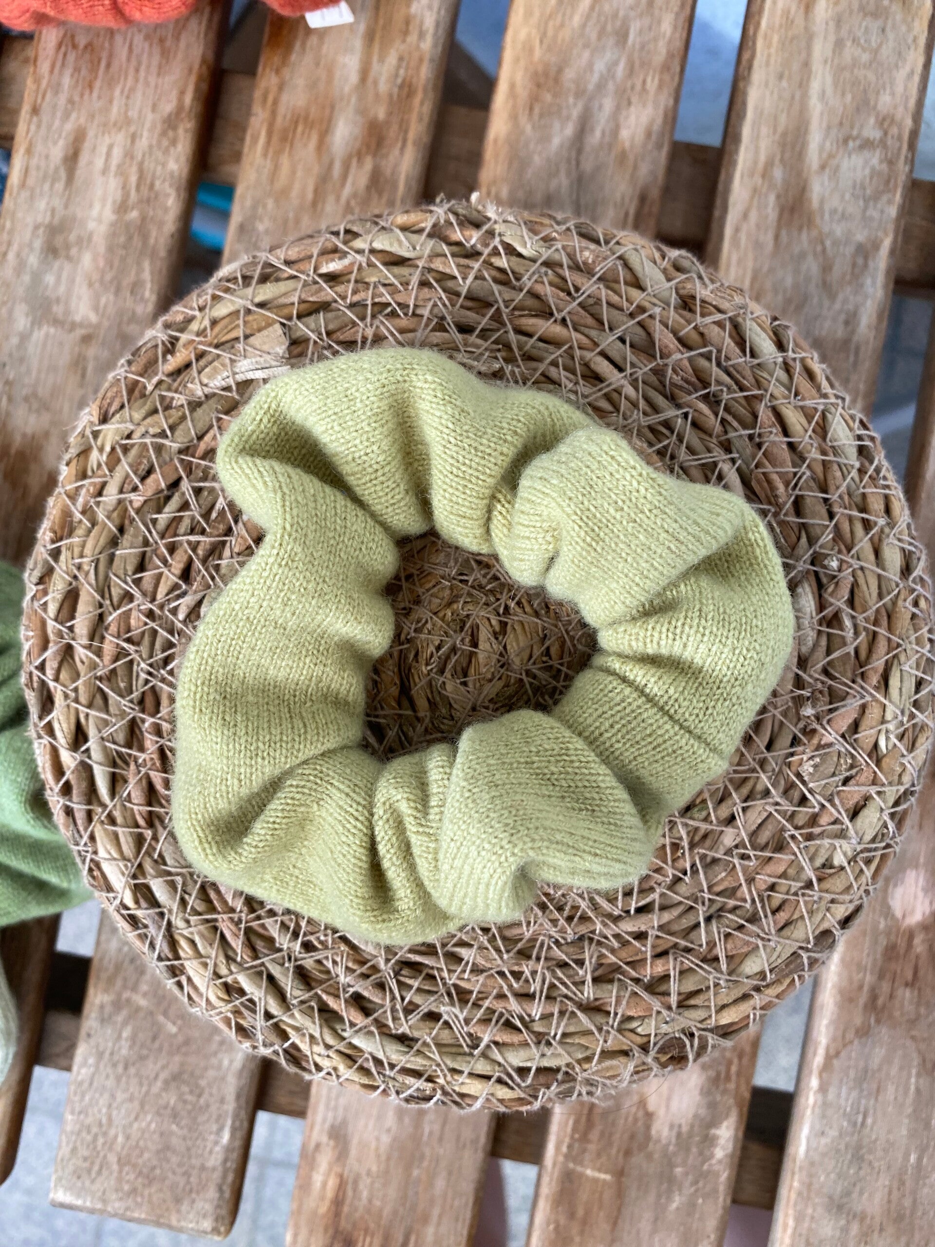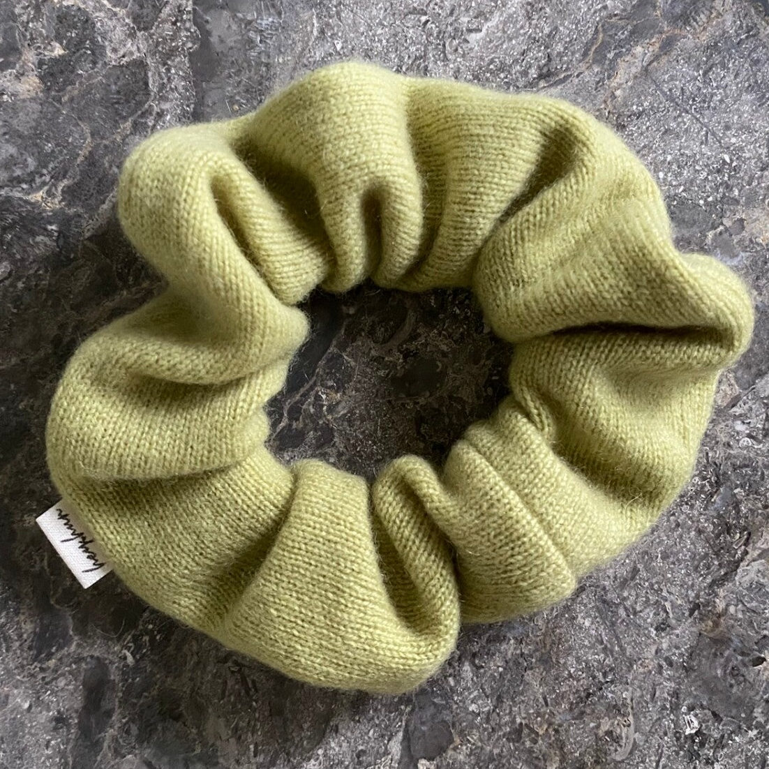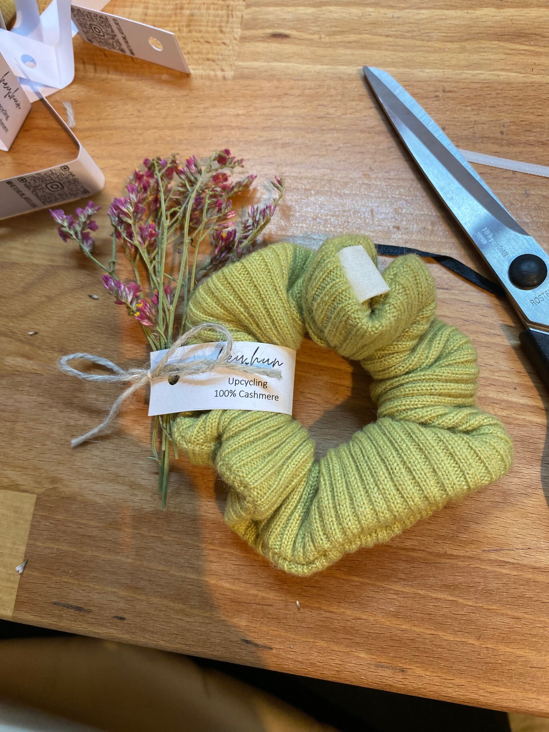 Die Scrunchies im dem tollen Pistachio wurden aus einem secondhand Pullover genäht, welcher einige Löcher hatte.