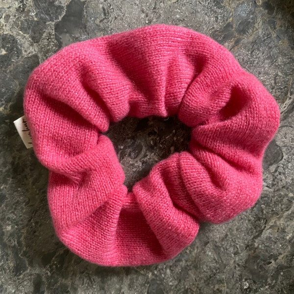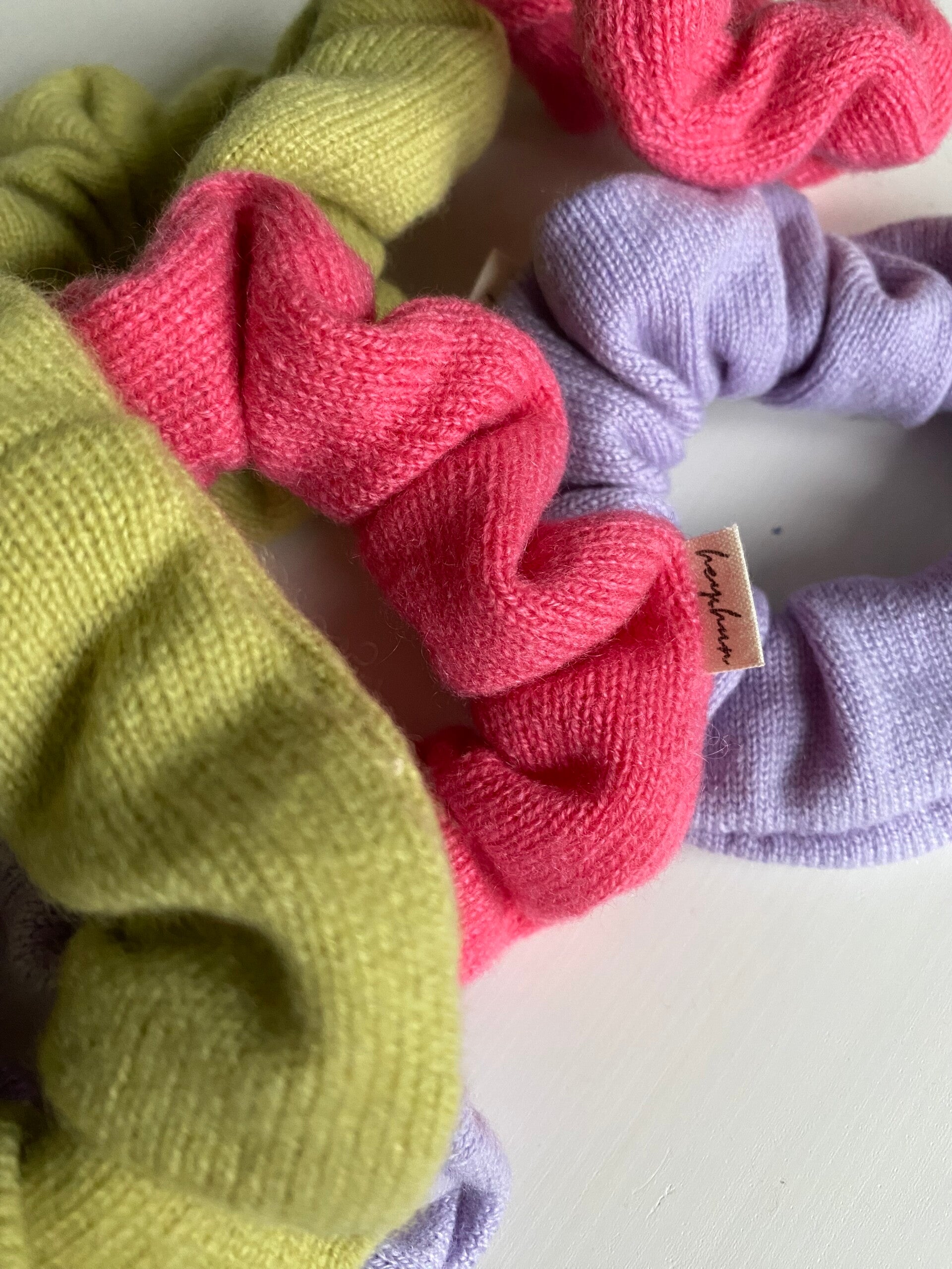 Die Scrunchies im dem tollen Pink wurden aus einem unglaublich weichen secondhand Pullover genäht, welcher viele Löcher hatte.