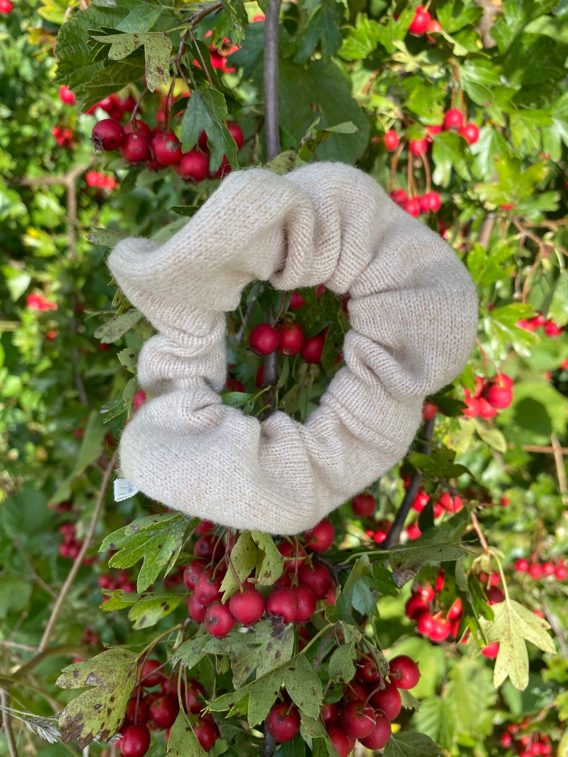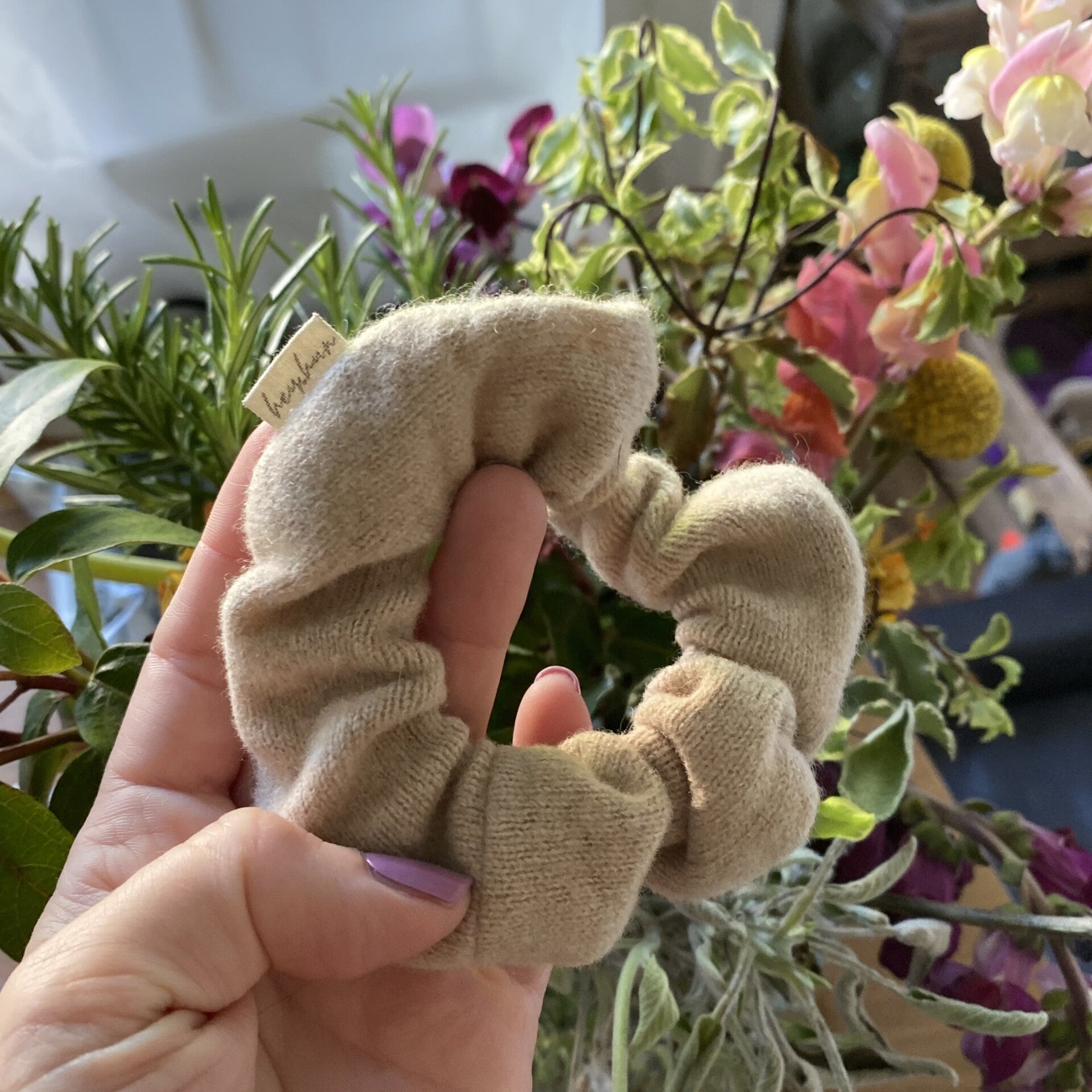 Die Scrunchies im dem zwei tollen warmen beige Farben wurden aus einem etwas festeren (warmes dunkleres beige) und einem leichteren (helleres kühleres beige) secondhand Pullover genäht, welche je einige Löcher und kleine Flecken am Ärmel hatten.