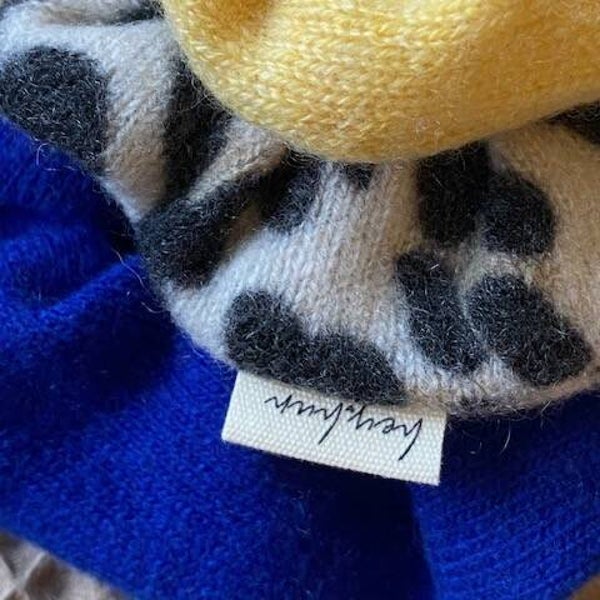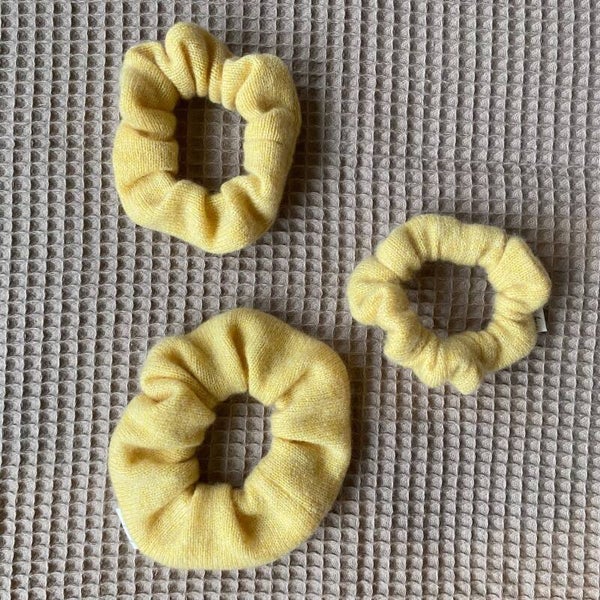 Die Scrunchies im wunderschönen Butteryellow sind aus einem wirklich butterweichen Kashmirpullover entstanden. Der zurvor lange ein Lieblingsstück war und an den Ärmeln durchgetragene Ellenbogen hatte. Etwas das leider bei sehr weichem Kashmir auch schneller entsteht als bei weniger weichem.