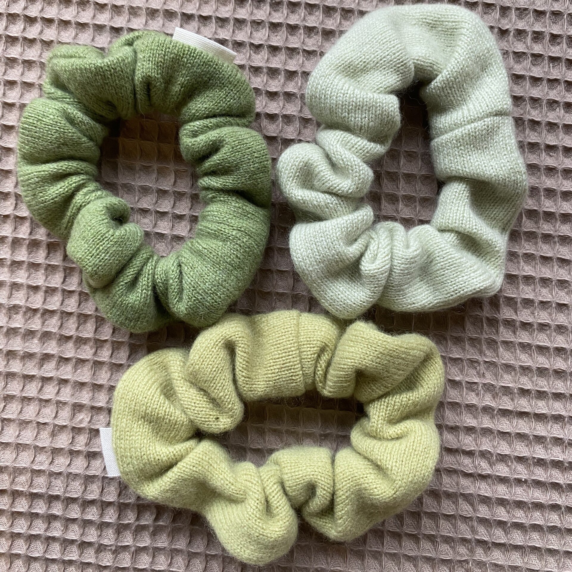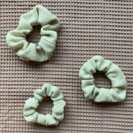 Aus einem löchrigen secondhand Pullover sind diese mintgrünen Scrunchies entstanden. Ganz zart in ihrer Farbe. Auf dem Bild mit dem orangenen Scrunchie ist die Farbe am besten getroffen.