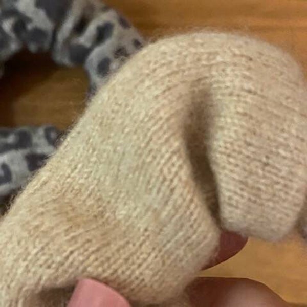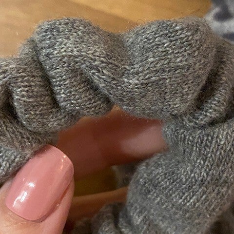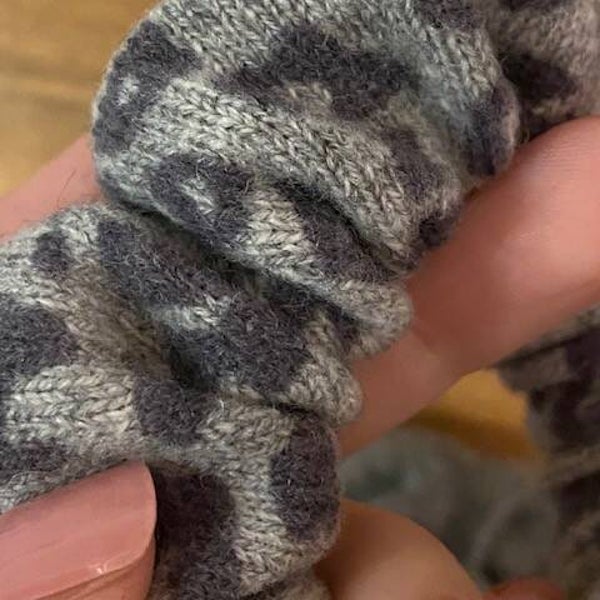 Das graue-Leoscrunchie ist ein einzelstück aus einer Kaschmir-Wollmischung und daher auch als B-Ware gekennzeichnet.