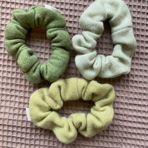 Die moosgrünen Scrunchies wurden aus einem secondhand Pullover mit einigen Löchern genäht. Das Detailbild gibt die Farbe am besten wieder.