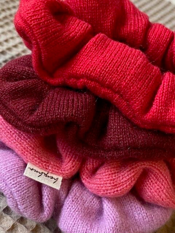Aus einem kirschroten secondhand Pullover mit vielen Bündchen sind neben den "normalen" Scrunchies auch wunderbare Ripp-Scrunchies entsanden. Das Rot ist kräftig, zeitlos und ganz klar ein Blickfang. Die Farbe ist in dem Detailbild mit den verschiedenen Scrunchies am besten zu erkennen.
