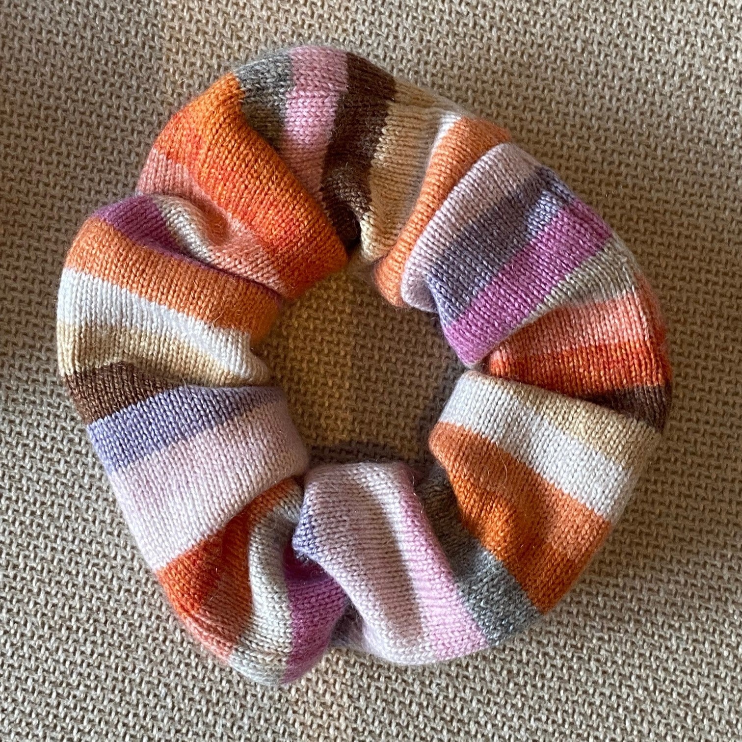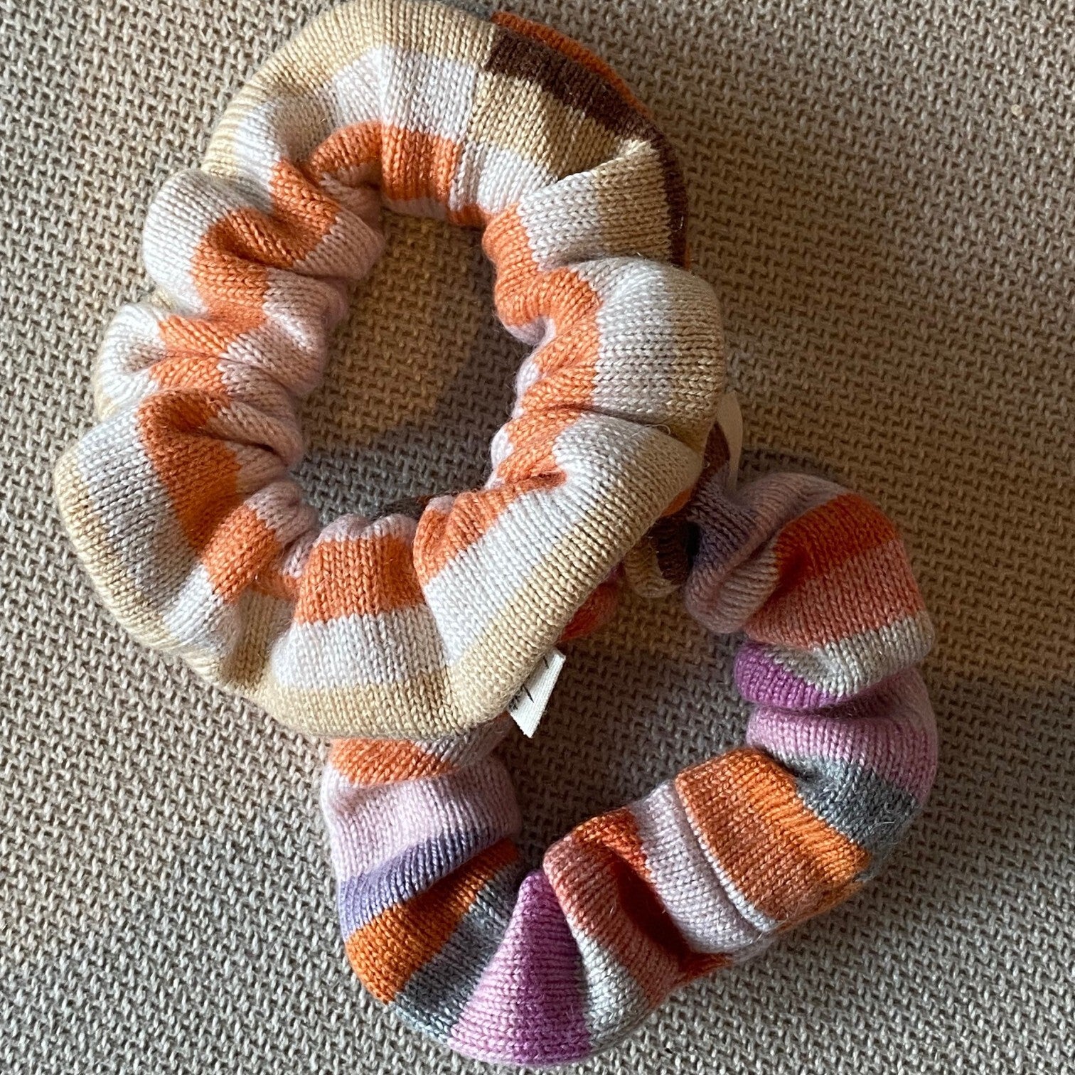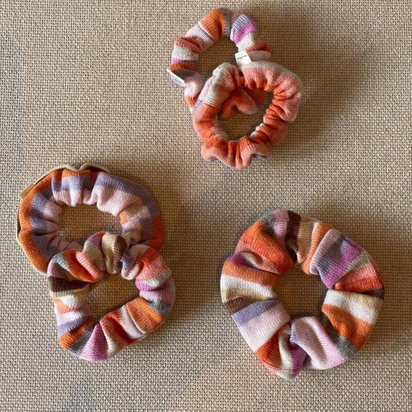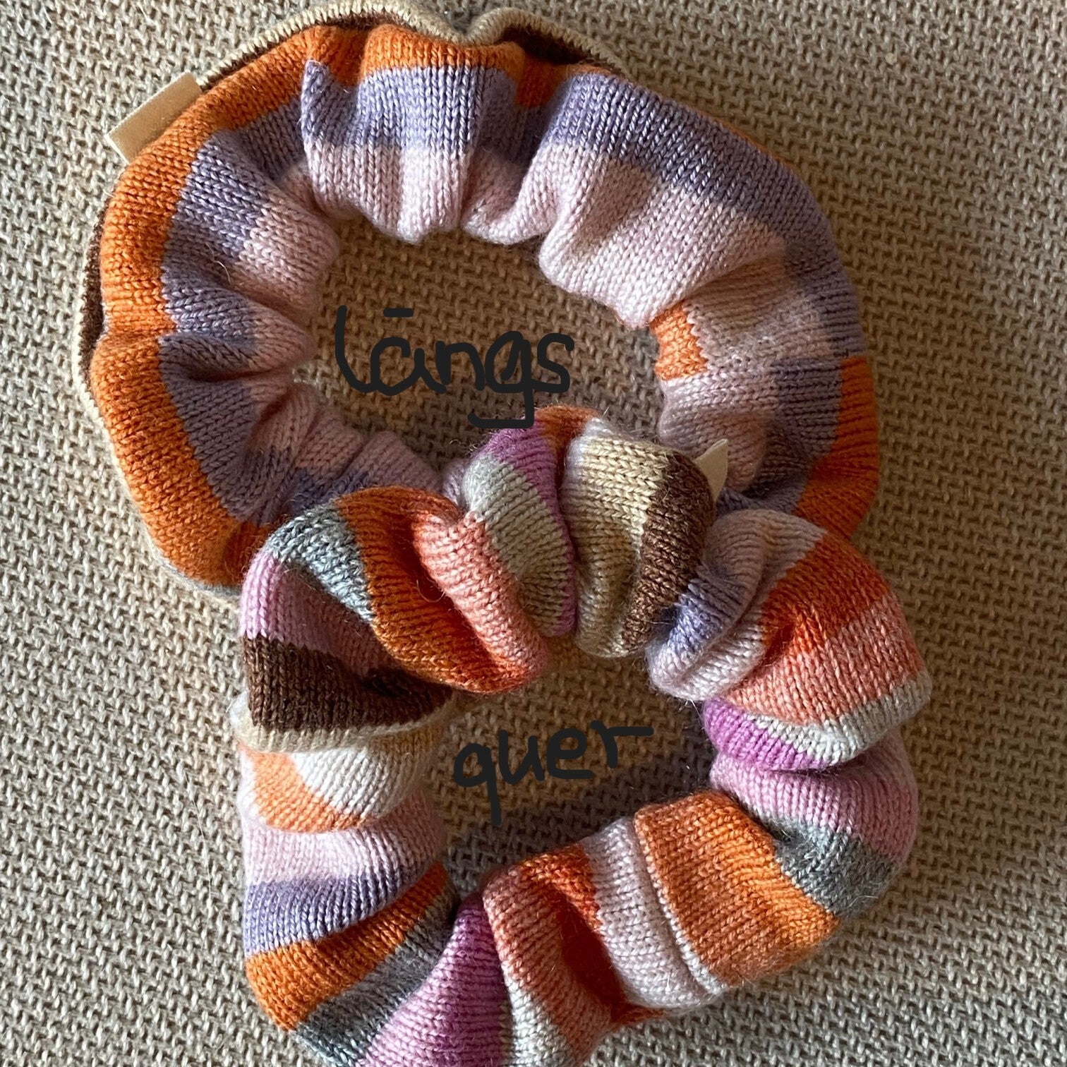 Viele ganz individuelle Scrunchies sind entstanden, als ein in herbstlichen Farben gestreifter secondhandpullover verarbeitet wurde. Durch das drehen des Zuschnitts sind dabei sowohl längs, wie auch quer gestreifte Scrunchies entstanden. Beides besonders und doch so unterschiedlich. Insbesondere bei diesen Srunchies ist jedes anders, so das die Farben bei dem gelieferten von denen der Abbildungen stärker abweichen können.